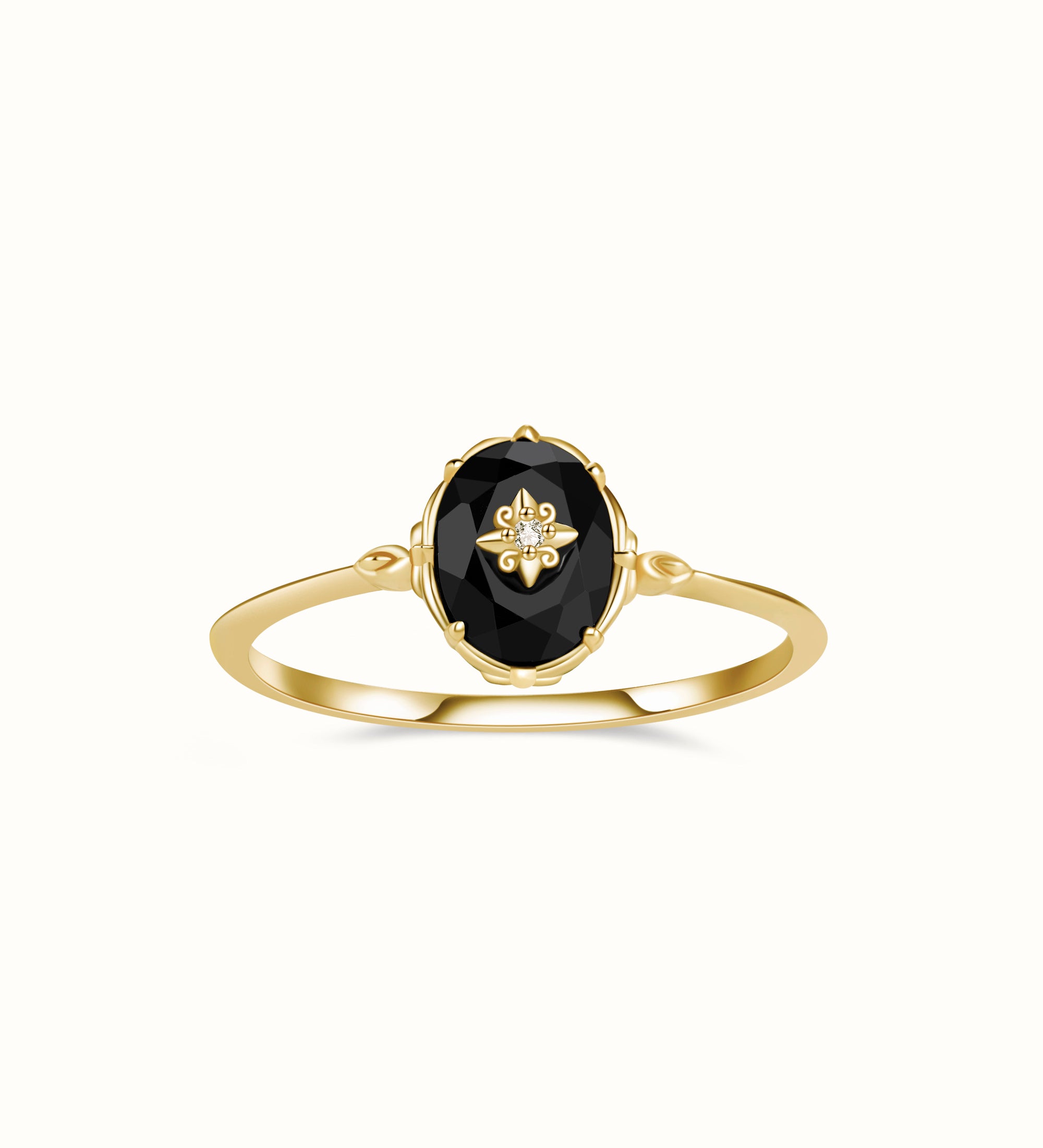 Add a dainty vintage touch to your style with Miwanna’s Black Onyx Ring. Crafted from 10K gold, this elegant ring features a faceted black onyx stone as its centerpiece, accented by a sparkling white zircon for a subtle yet brilliant highlight. The intricate vintage-inspired design, paired with a slim 1mm band, exudes timeless sophistication and charm, making it a versatile choice for any occasion.