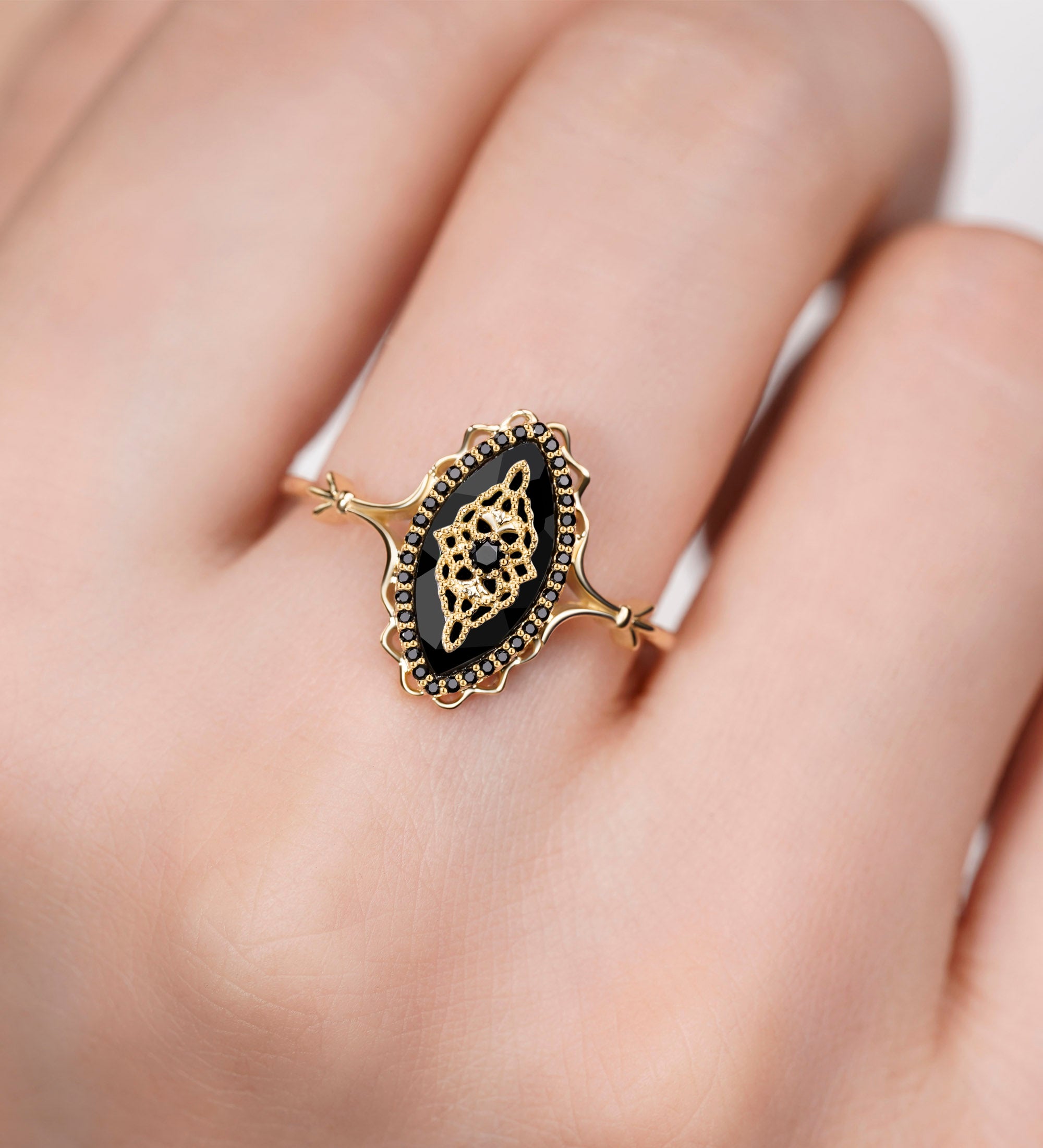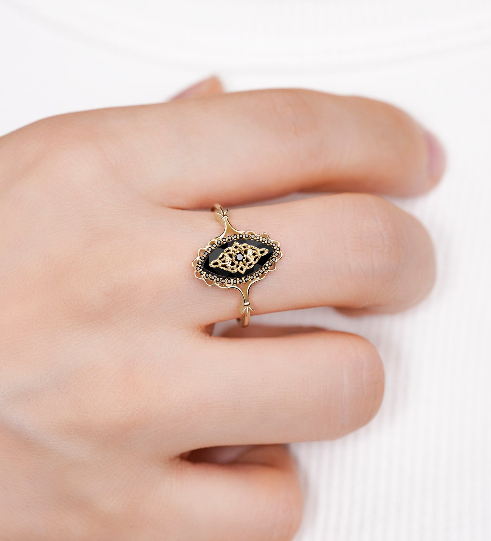 Wear it alongside other vintage-inspired pieces or let it shine as a bold statement accessory. Whether you're dressing up or keeping it simple, this ring is sure to draw admiration. For those seeking a distinctive and sophisticated symbol of love, the Black Onyx Ring also makes a memorable vintage wedding ring choice.