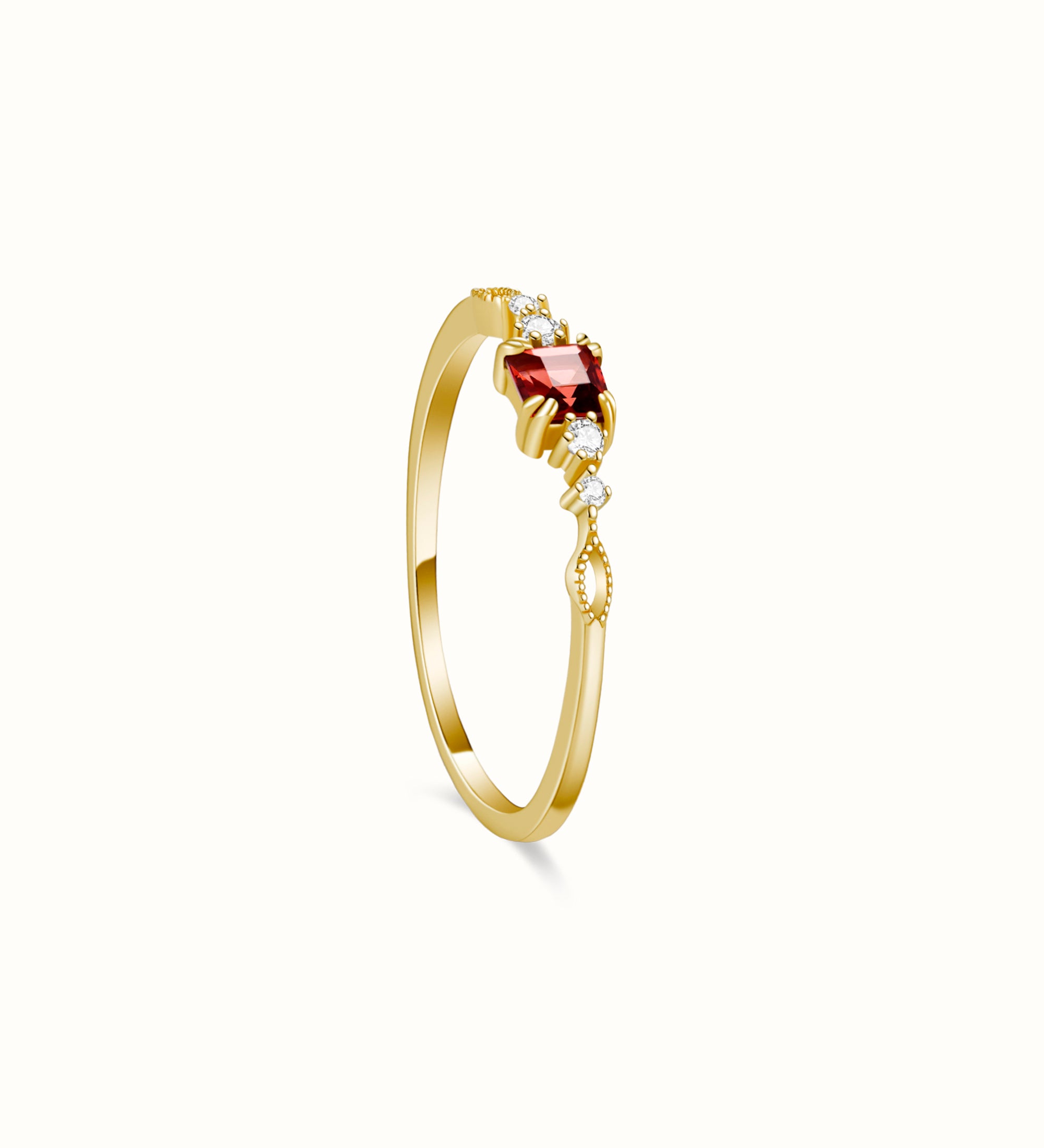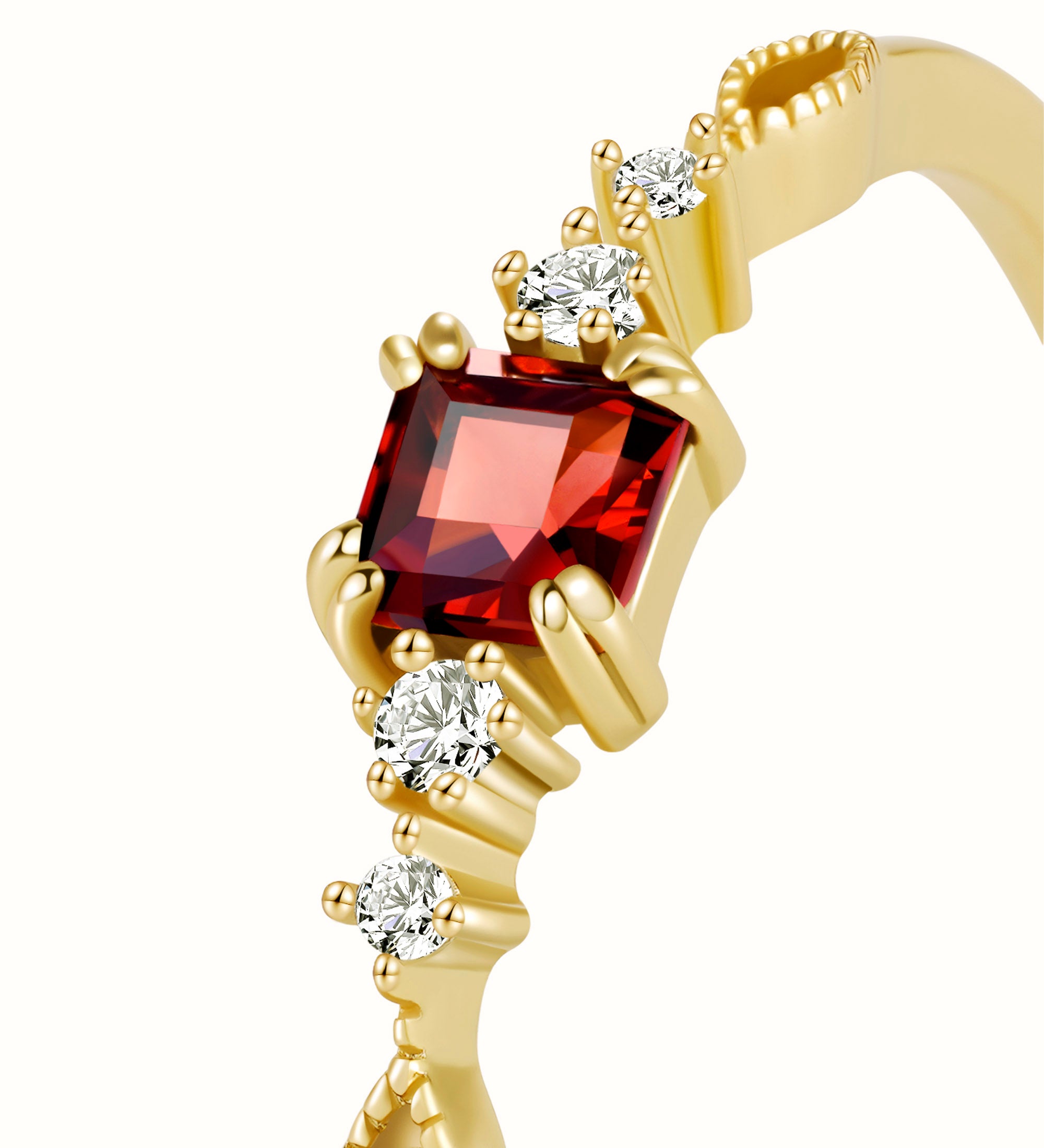 Elevate your style with Miwanna’s Princess-Cut Garnet Ring, beautifully crafted in 10K solid gold. This vintage-inspired ring features a striking princess-cut garnet at its center, complemented by shimmering lab-grown diamond accents. The delicate detailing adds a timeless elegance, making it perfect for both everyday wear and special occasions.