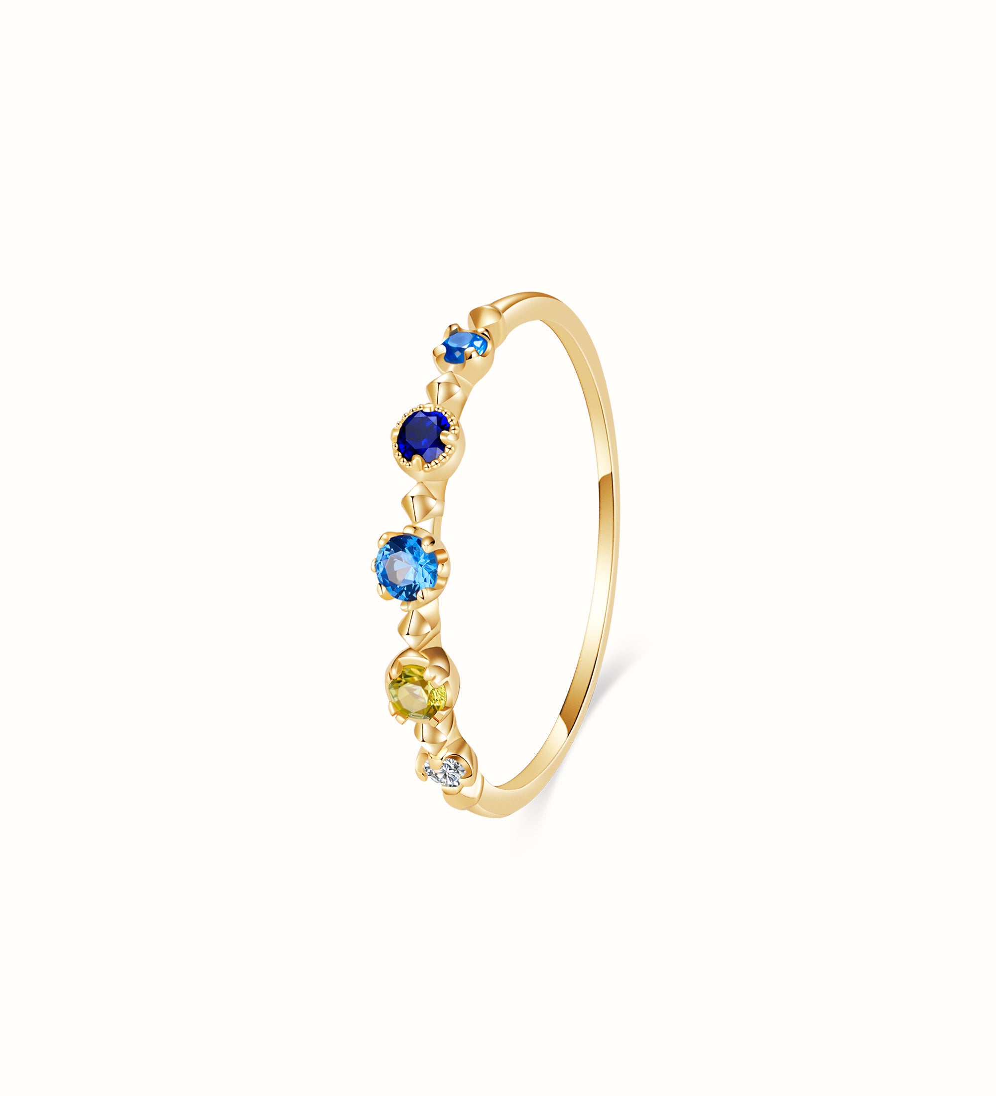 Add a vibrant touch to your style with Miwanna’s Ocean Breeze Stacking Band. Crafted from 10K gold, this ring features a stunning blend of blue spinel, blue zircon, white zircon, blue topaz, and peridot gemstones, each set to shine brilliantly. With a slim 1mm band, it’s perfect for stacking or wearing solo, offering both elegance and versatility for any occasion.